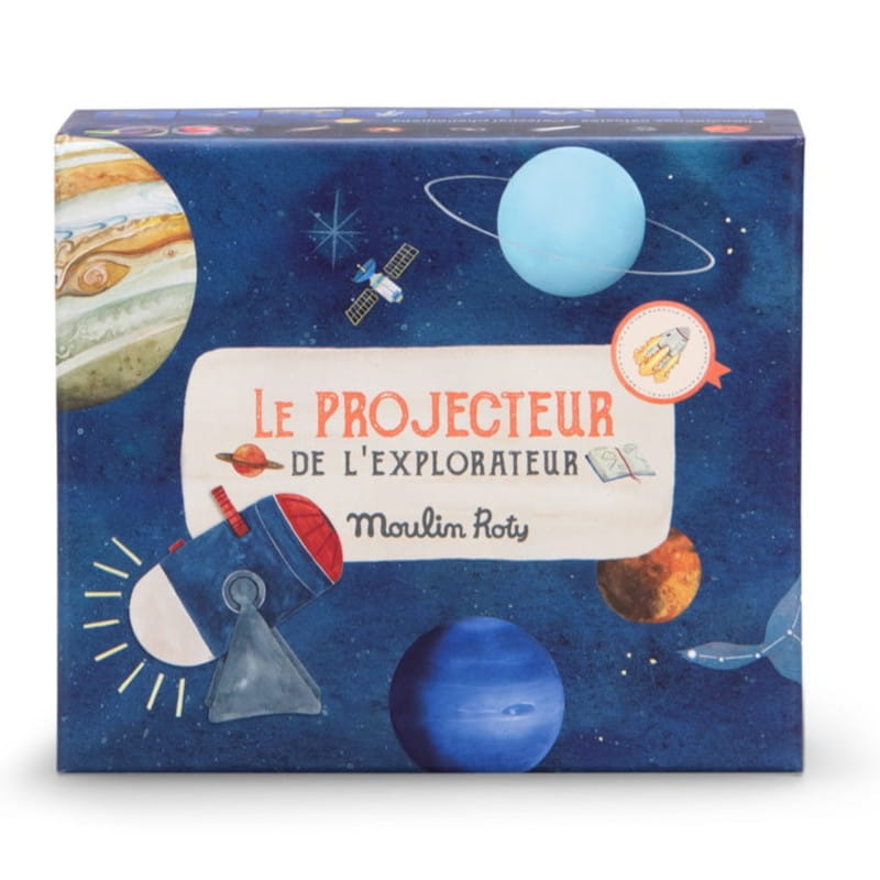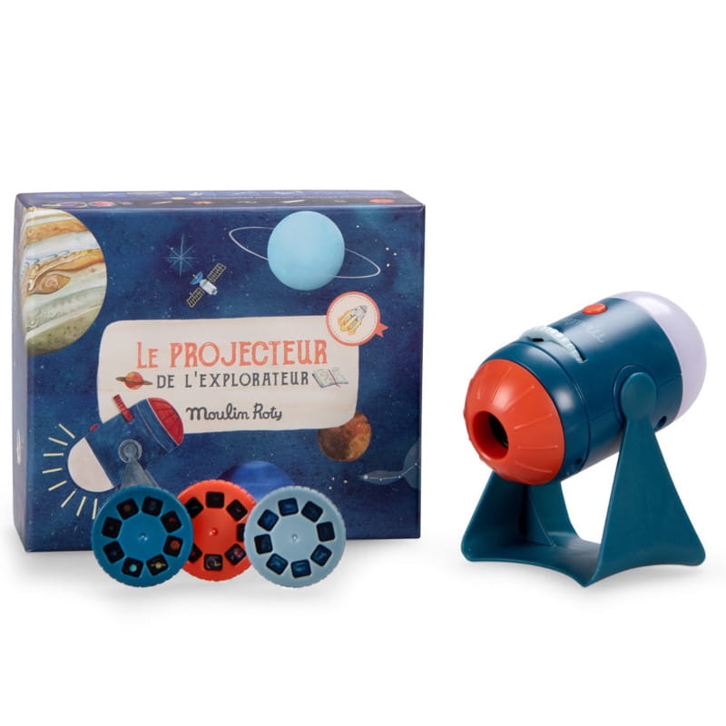 Projektor 2w1 z francuskiej marki Moulin Roty. Z jednej strony projektor, z drugiej strony - lampka nocna LED z timerem 15 min.