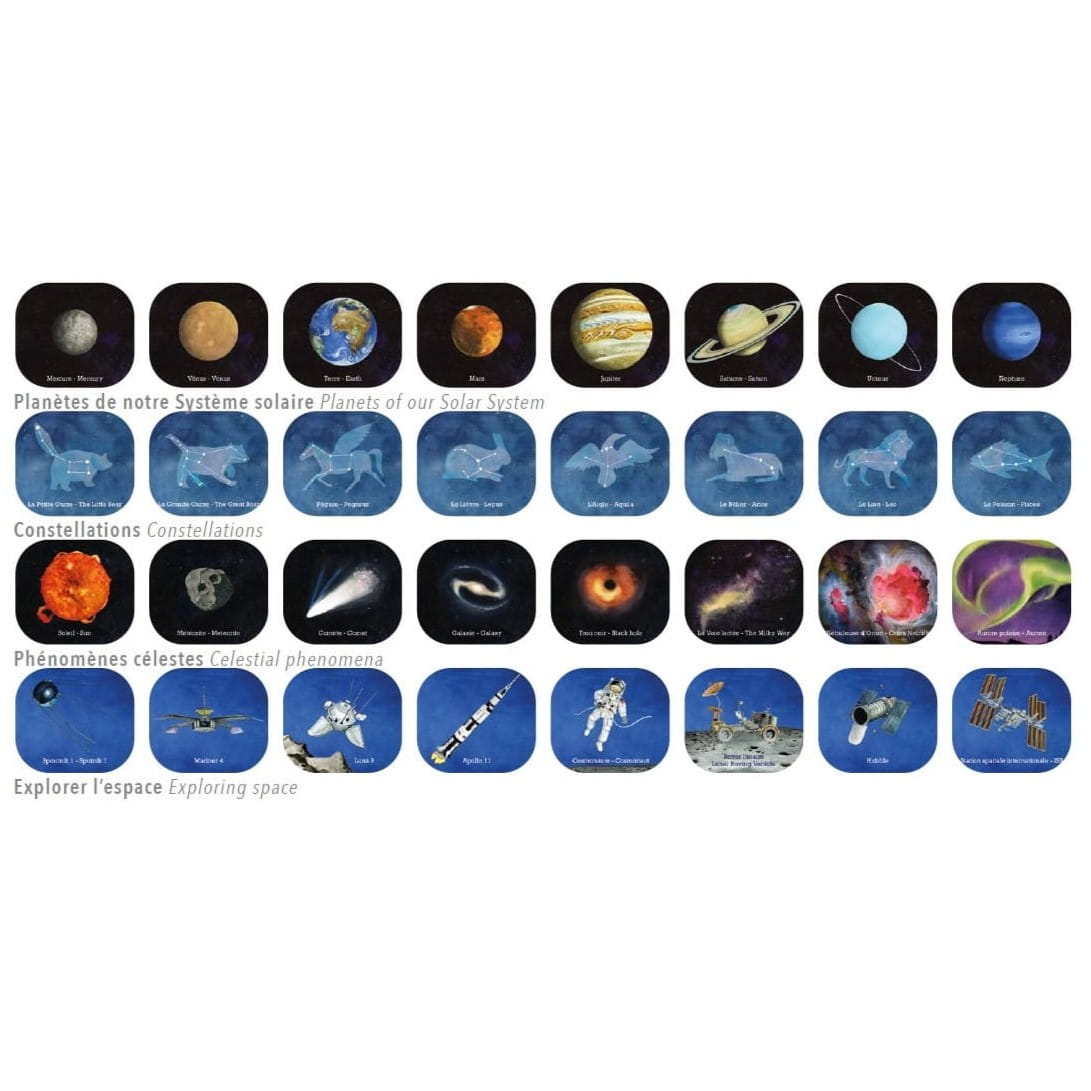 Lista zdjęć na krążkach: Planety Układu Słonecznego, Konstelacje gwiazd, Niezwykłe zjawiska, Odkrywanie kosmosu.