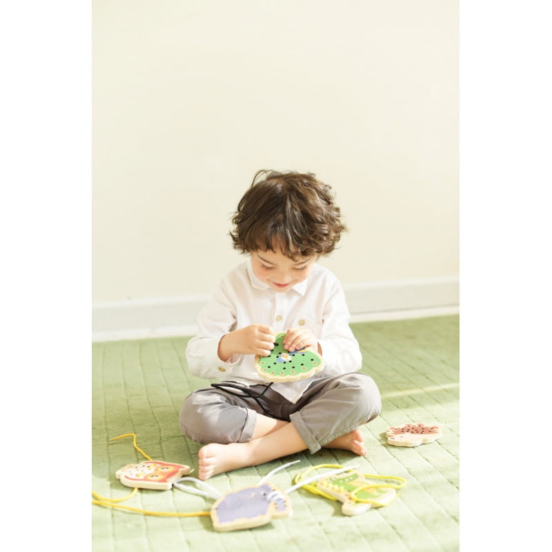 Sznurowanie to wciągająca zabawa. Przeplatanie sznurówki ćwiczy sprawność manualną dziecka.