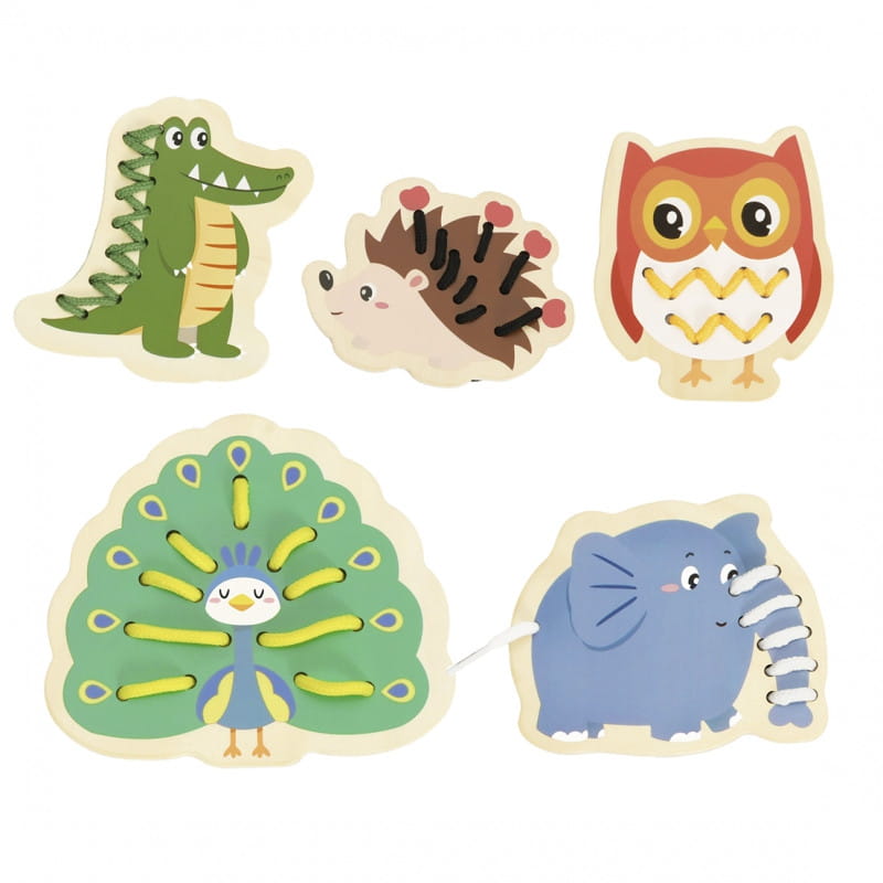 Zestaw zawiera 5 zwierzątek: słonika, jeżyka, krokodyla, pawia i sowę.