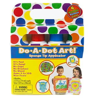 Flamastry Kropkowe stworzone przez Do-A-Dot Art to zmywalna farba w płynie w dużej, dopasowanej do rączek dziecka butelce, zakończonej dużą, miękką gąbeczką, która nie wysycha i zawsze pozostawia na kartce idealną kropkę. Butelka zawiera nietoksyczną, zmywalną farbę, szybko wysychającą, w żywych kolorach, która nie rozlewa się, ani nie rozpryskuje.