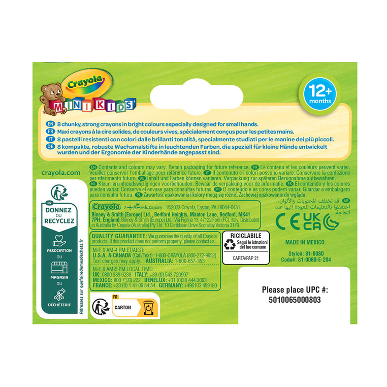 Komplet zawiera 8 kredek w różnych kolorach, o szerokim, ergonomicznym kształcie, który ułatwia pewny chwyt i wygodne rysowanie. Kredki gładko prowadzą się po papierze, pozostawiając intensywne, nasycone kolory, a ich wytrzymała konstrukcja zapobiega kruszeniu i łamaniu podczas zabawy.