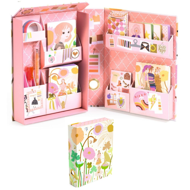 Pudełko otwiera się jak książka, odsłaniając asortyment wysokiej jakości artykułów piśmienniczych: 2 notesiki, 1 bloczek, 4 zaproszenia, 4 koperty, 1 taśmę maskującą, 4 arkusze naklejek i 2 długopisy żelowe. Prawdziwa skrzynia skarbów dla miłośników eleganckich akcesoriów papierniczych!