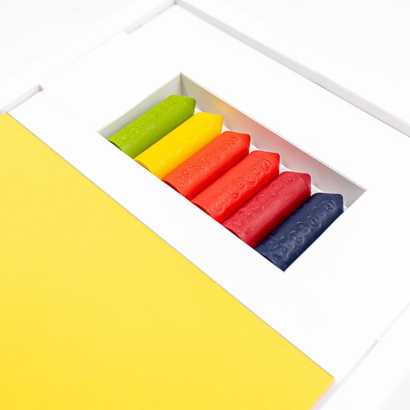 - 6 kolorowych kredek z wosku pszczelego, których kształt jest specjalnie dostosowany do rączki już rocznych pociech;