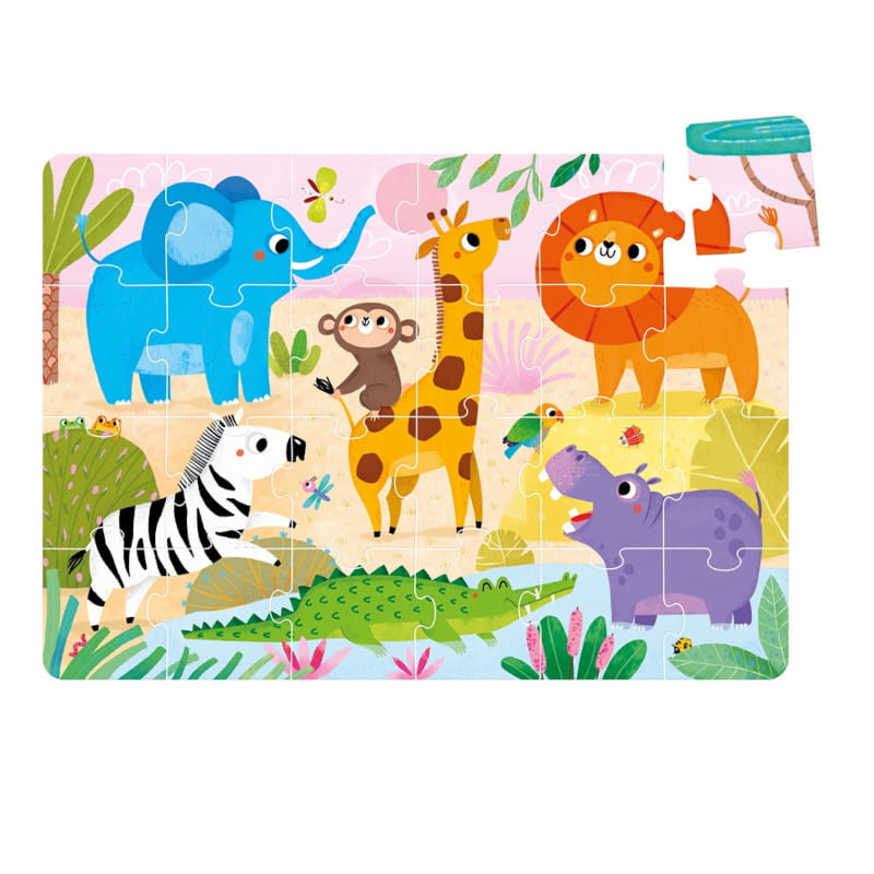 W prezentowym pudełku znajduje się duża 24-elementowa układanka, która przedstawia znane i lubiane przez najmłodszych odkrywców dzikie zwierzęta z afrykańskiej sawanny. Podczas zabawy dzieci będą doskonalić sprawność rączek, spostrzegawczość i wyobraźnię.