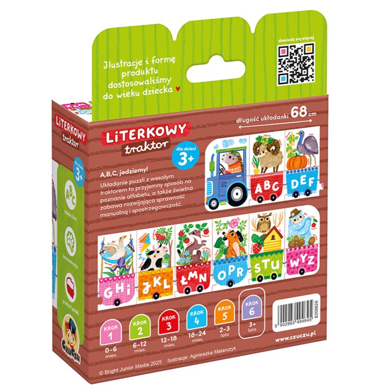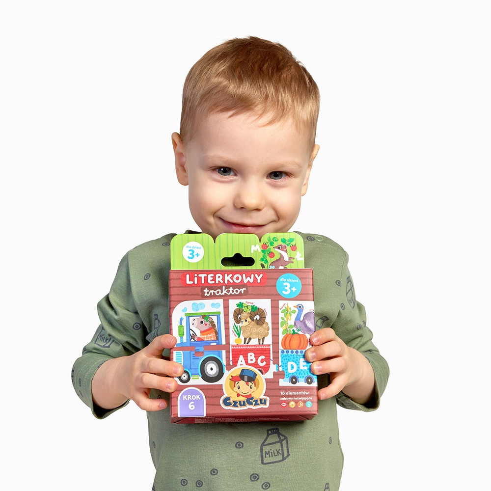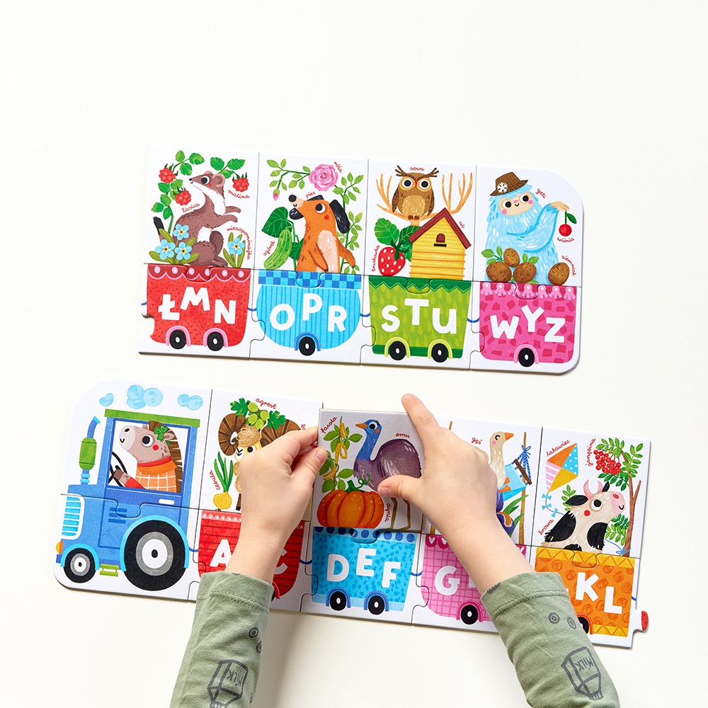 Długi, kolorowy traktor przewozi wagoniki, w których znajdziecie zwierzątka, towary i rośliny na kolejne litery abecadła.