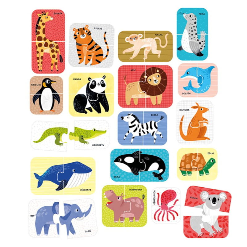 Edukacyjny zestaw zawiera 18 dużych dwuelementowych układanek. To świetny pomysł na pierwsze puzzle. Piękne ilustracje przedstawiają uwielbiane przez dzieci i bardzo sympatyczne zwierzęta z różnych stron świata.