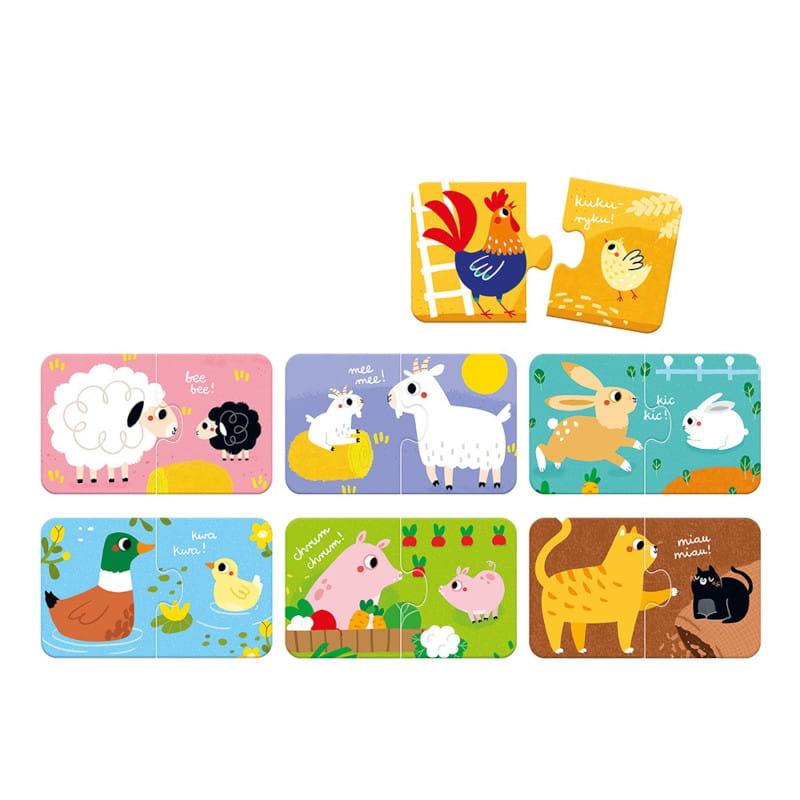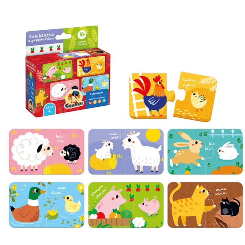 Dwuelementowe układanki przedstawiają urocze zwierzątka z gospodarstwa. Wyszukiwanie i łączenie elementów to świetna zabawa, która pozwala doskonalić sprawność dłoni, zmysły i zdobywać nową wiedzę na wesoło. Urocze ilustracje inspirują do mnóstwa rozwijających aktywności. To świetny pomysł na pierwsze puzzle dla malucha.