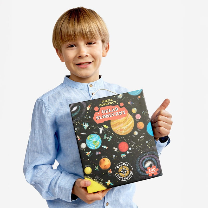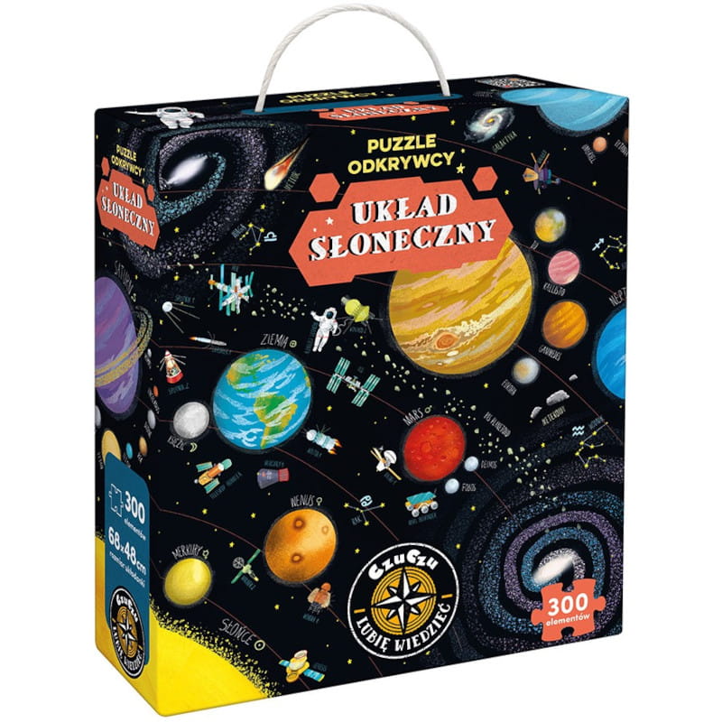 Duże, pełne szczegółów i pięknie zilustrowane 300-elementowe puzzle przedstawiają planety, księżyce, pojazdy kosmiczne, naukowców i odkrywców Układu Słonecznego.