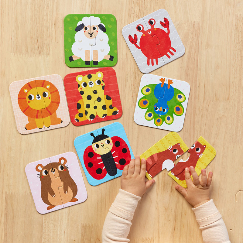 Edukacyjny zestaw sprawdzi się jako pierwsze puzzle dla maluchów. Składa się 8 dużych dwuelementowych układanek. Możliwe są także nieoczywiste połączenia, co sprawia dodatkową radość.