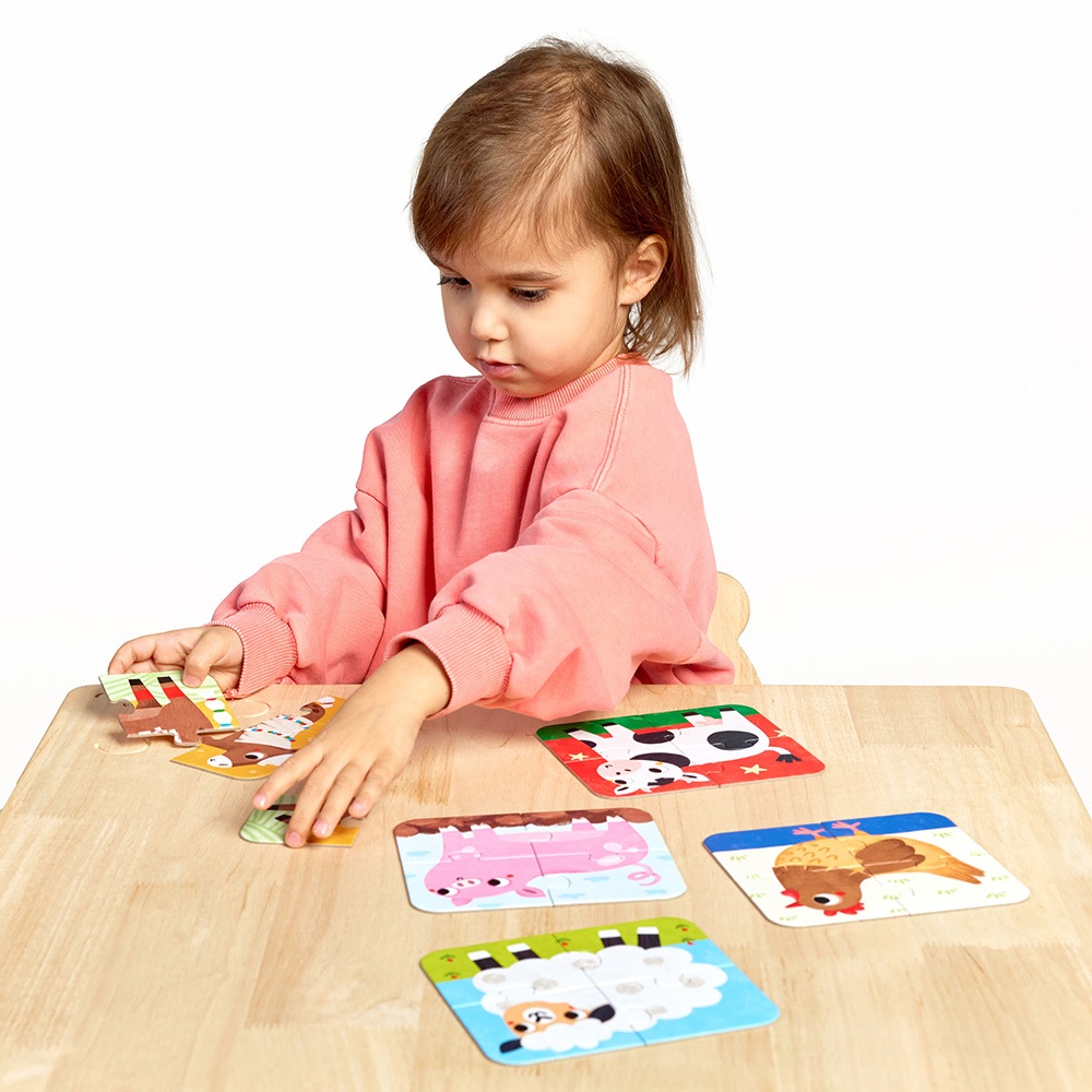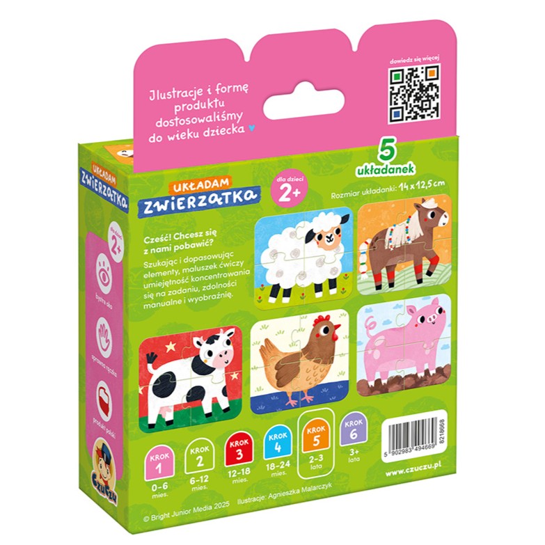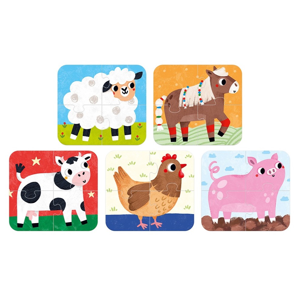 4-elementowe puzzle z wesołymi zwierzątkami z gospodarstwa. Świetnie sprawdzą się jako pierwsze puzzle malucha. Zestaw składa się z 5 układanek.