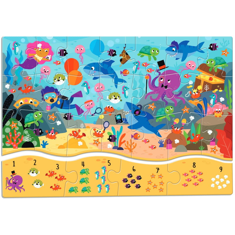 Pierwsze puzzle matematyczne dla maluszka. Do nauki cyferek, liczenia i opanowywania pojęcia różnic ilościowych. Po ułożeniu obrazka o wymiarach 50x35cm z 25 elementów, rozpoczyna się zabawa w odszukiwanie, przeliczanie, sprawdzanie i porównywanie.