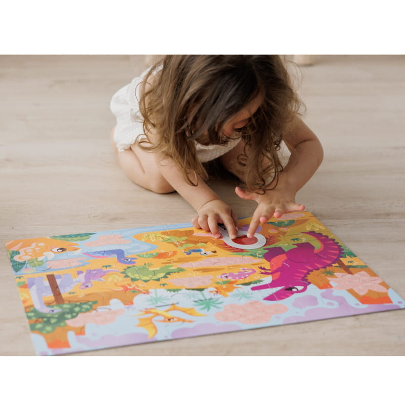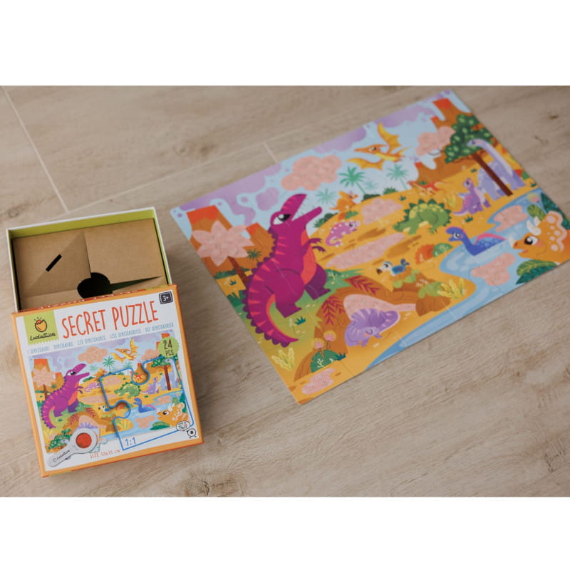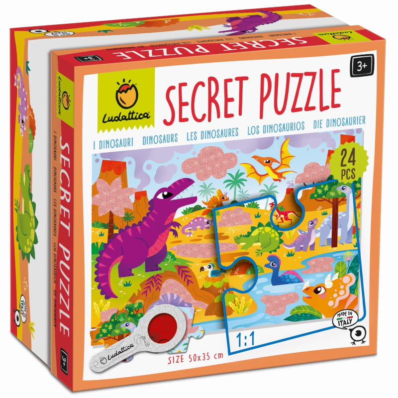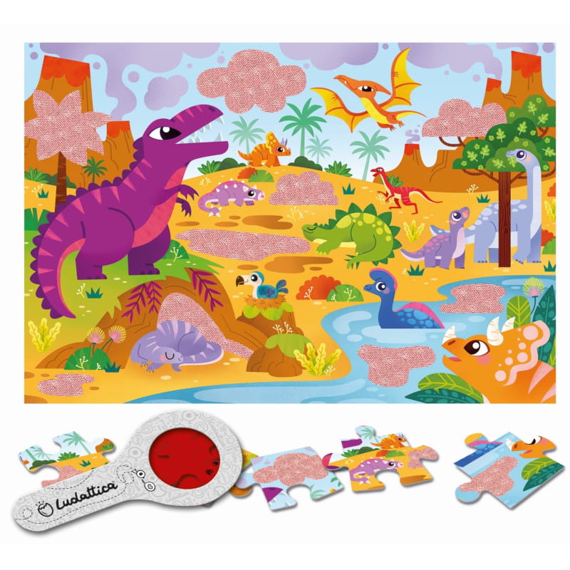 Puzzle Dinozaury z ukrytymi motywami do wyszukiwania za pomocą specjalnej lupy. Przygoda rozpoczyna się po ułożeniu obrazka. Odkrywanie tego, czego gołym okiem nie widać, będzie źródłem frajdy dla małych tropicieli zagadek. Zabawne puzzle, ekscytujące i pobudzające wyobraźnię.