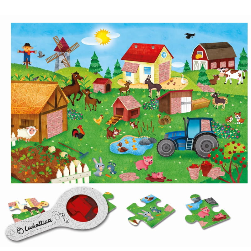 Puzzle Gospodarstwo Rolne z ukrytymi motywami do wyszukiwania za pomocą specjalnej lupy. Przygoda rozpoczyna się po ułożeniu obrazka. Odkrywanie tego, czego gołym okiem nie widać, będzie źródłem frajdy dla małych tropicieli zagadek. Zabawne puzzle, ekscytujące i pobudzające wyobraźnię.