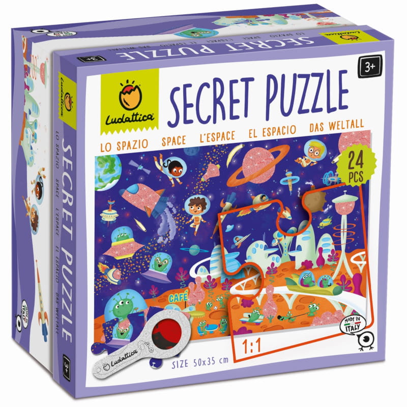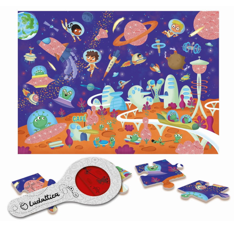 Puzzle Kosmos z ukrytymi motywami do wyszukiwania za pomocą specjalnej lupy. Przygoda rozpoczyna się po ułożeniu obrazka. Odkrywanie tego, czego gołym okiem nie widać, będzie źródłem frajdy dla małych tropicieli zagadek. Zabawne puzzle, ekscytujące i pobudzające wyobraźnię.