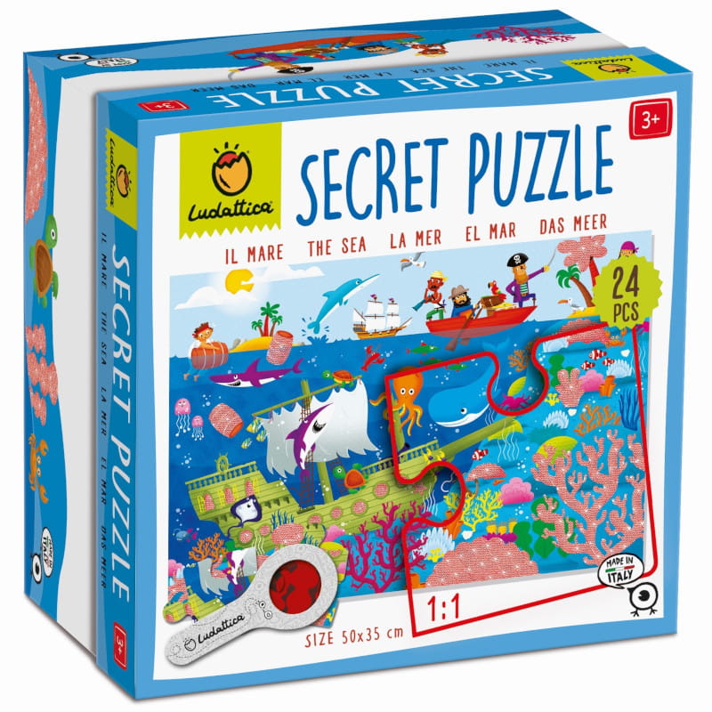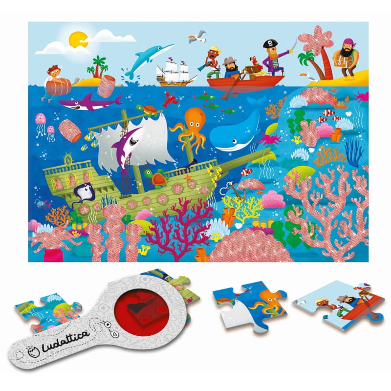 Puzzle Morze z ukrytymi motywami do wyszukiwania za pomocą specjalnej lupy. Przygoda rozpoczyna się po ułożeniu obrazka. Odkrywanie tego, czego gołym okiem nie widać, będzie źródłem frajdy dla małych tropicieli zagadek. Zabawne puzzle, ekscytujące i pobudzające wyobraźnię.