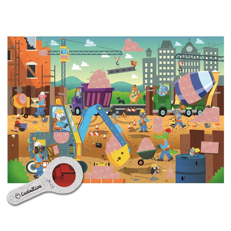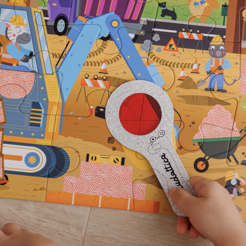 Puzzle Plac Budowy z ukrytymi motywami do wyszukiwania za pomocą specjalnej lupy. Przygoda rozpoczyna się po ułożeniu obrazka. Odkrywanie tego, czego gołym okiem nie widać, będzie źródłem frajdy dla małych tropicieli zagadek. Zabawne puzzle, ekscytujące i pobudzające wyobraźnię.