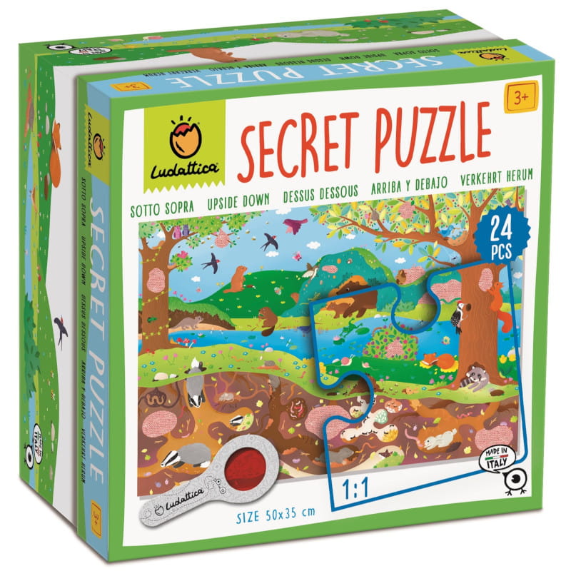 Puzzle Pod Ziemią i w Kryjówkach z ukrytymi motywami do wyszukiwania za pomocą specjalnej lupy. Przygoda rozpoczyna się po ułożeniu obrazka. Odkrywanie tego, czego gołym okiem nie widać, będzie źródłem frajdy dla małych tropicieli zagadek. Zabawne puzzle, ekscytujące i pobudzające wyobraźnię.