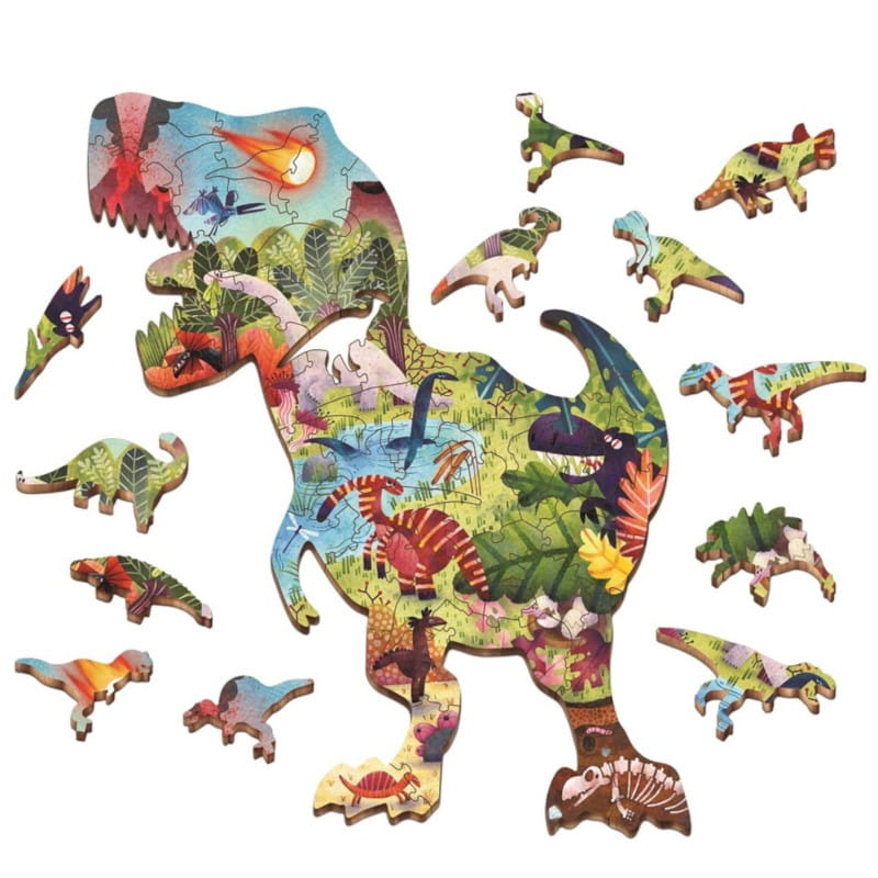 Pięknie ilustrowana drewniana układanka o wyjątkowym kształcie Dinozaura.