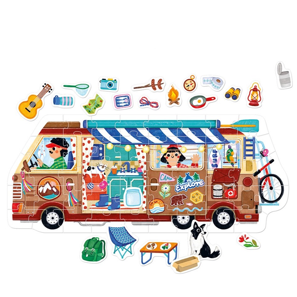 Puzzle, imponujący pojazd i mnóstwo dodatków? Mamy to! Duży, kolorowy i pełen szczegółów puzzlowy kamper składa się z 45 elementów. Do pojazdu dołączono 18 obrazków do dokładania i poradnik pełen pomysłów na kreatywne zabawy.
