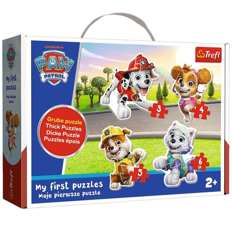 Zestaw zawiera cztery obrazki przedstawiające sympatycznych bohaterów Psiego Patrolu – Marshalla, Skye, Rubble`a i Everest – w formie dużych, grubych elementów, które łatwo chwycić małymi rączkami. Każda układanka ma inną liczbę elementów (3, 4, 5 i 6), co pozwala dziecku stopniowo rozwijać swoje umiejętności.