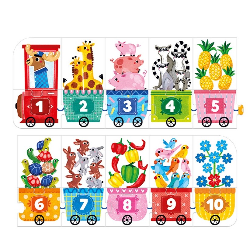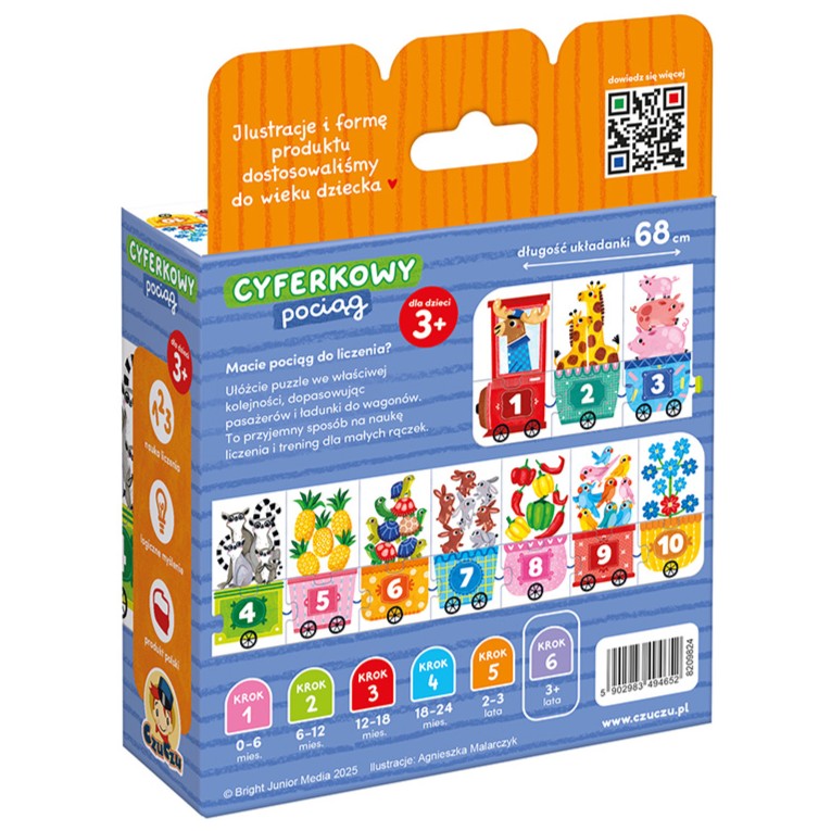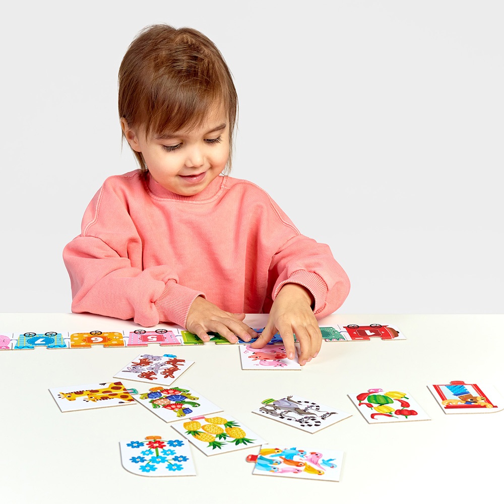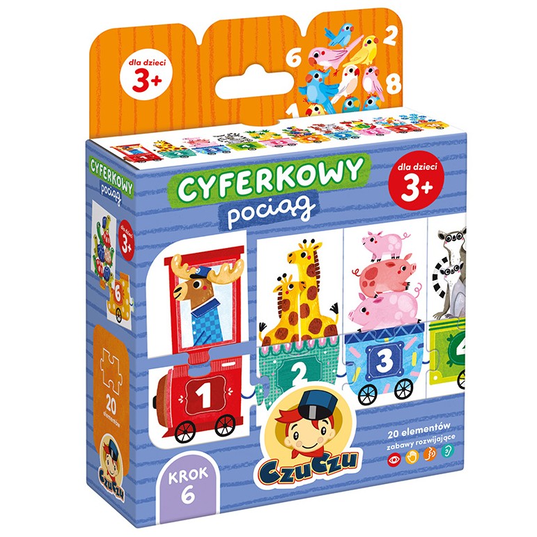 Długi, kolorowy pociąg przewozi wagoniki, w których znajdziecie zwierzątka, towary i rośliny. Aby ułożyć puzzle we właściwej kolejności, trzeba je dobrze policzyć. Dajcie się zabrać w edukacyjną podróż i bawcie się na wiele sposobów!