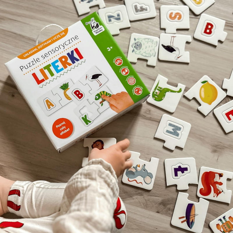 Puzzle sensoryczne Literki to zestaw układanek angażujący zmysł dotyku i wprowadzający dzieci w świat liter.