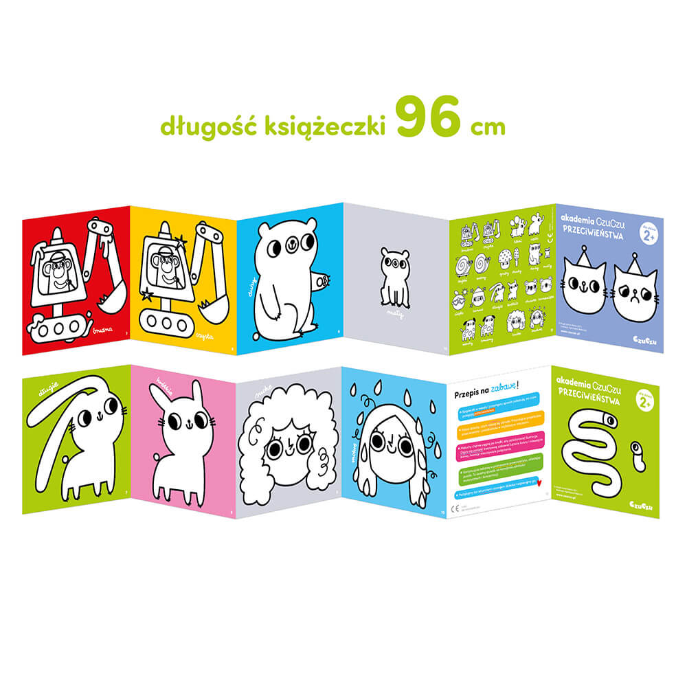 Akademia Czuczu Przeciwieństwa to 2 książeczki harmonijkowe do kolorowania i edukacyjny zestaw puzzli dwuelementowych.
