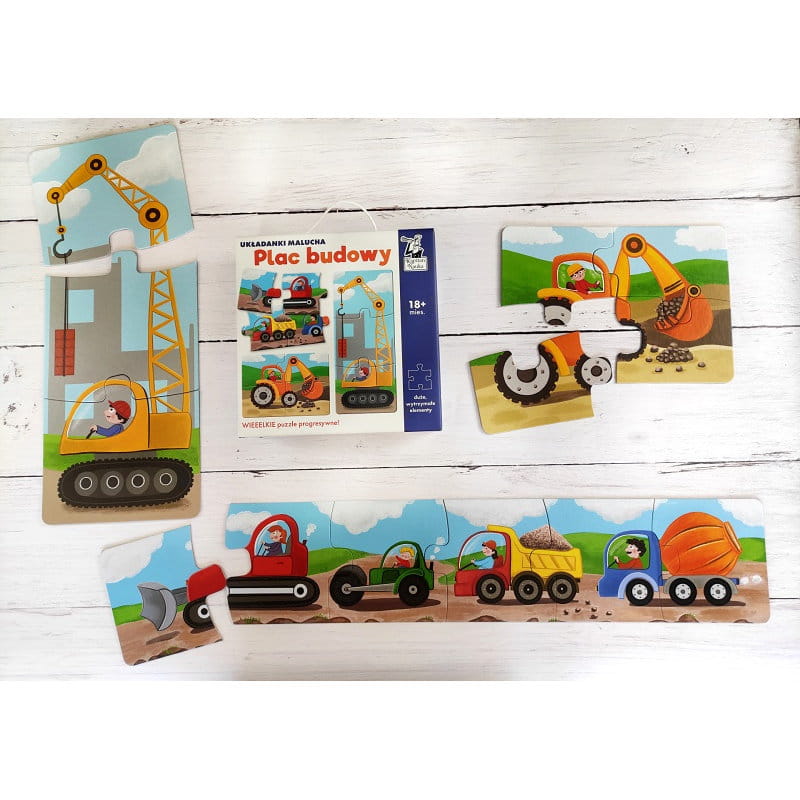 Trzy wielkie układanki dla najmłodszych wielbicieli pojazdów i maszyn, idealne do rozpoczęcia przygody z puzzlami. Dzieci stopniowo uczą się układać coraz trudniejsze obrazki złożone z 3, 4 i 6 elementów, w orientacji pionowej i poziomej, rozwijając przy tym wyobraźnię przestrzenną oraz sprawność manualną.