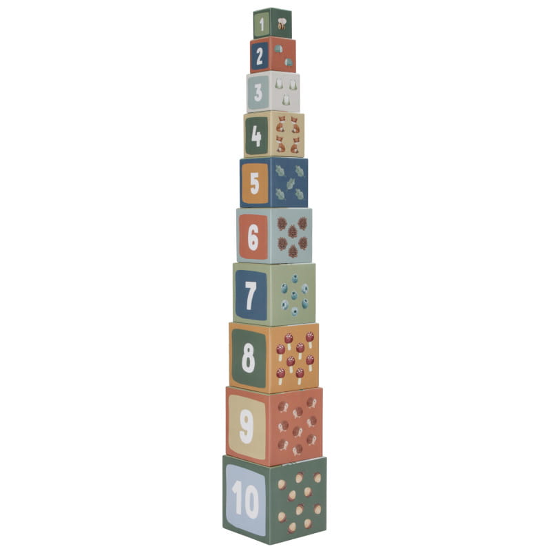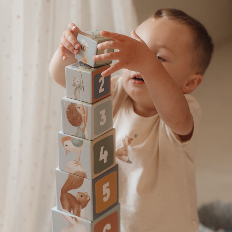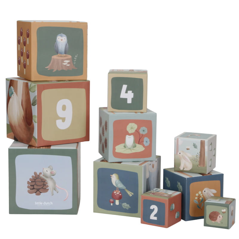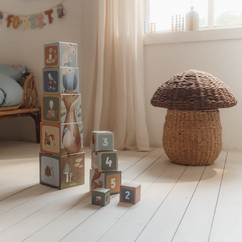 Poznajcie razem zwierzątka z magicznego lasu - wiewiórki, lisy, króliczki, jeże, sowy. Każdy klocek zawiera piękne ilustracje z kolekcji Forest Friends i daje dużo pomysłów na czarującą zabawę. Dziecko może zbudować wysoką wieżę, układając klocki jeden na drugim lub ustawić je poziomo na podłodze. Można układać leśne zwierzątka od największego do najmniejszego oraz poprzez zabawę uczyć się cyferek i liczenia. Doskonale sprawdzi się również jako pojemniczki na dziecięce skarby.