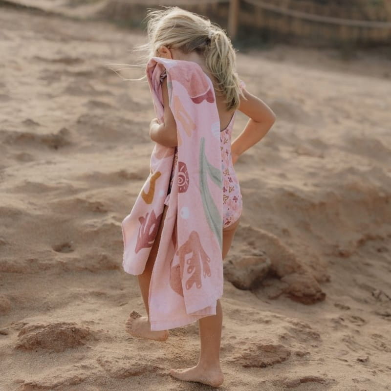 Ten miękki ręcznik z wzorem w morskie skarby przyjemnie otuli po zabawach wodnych. Sprawdzi się podczas dnia na plaży, zabawie na basenie lub kąpieli w domu.