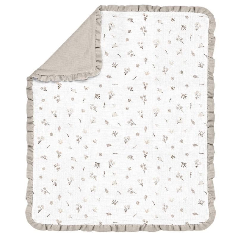Dwustronny kocyk z kolekcji Wild flowers to połączenie delikatności i stylu. Wykonany z dwóch warstw naturalnego muślinu bawełnianego typu double gauze, zachwyca swoją lekkością i szlachetną strukturą.