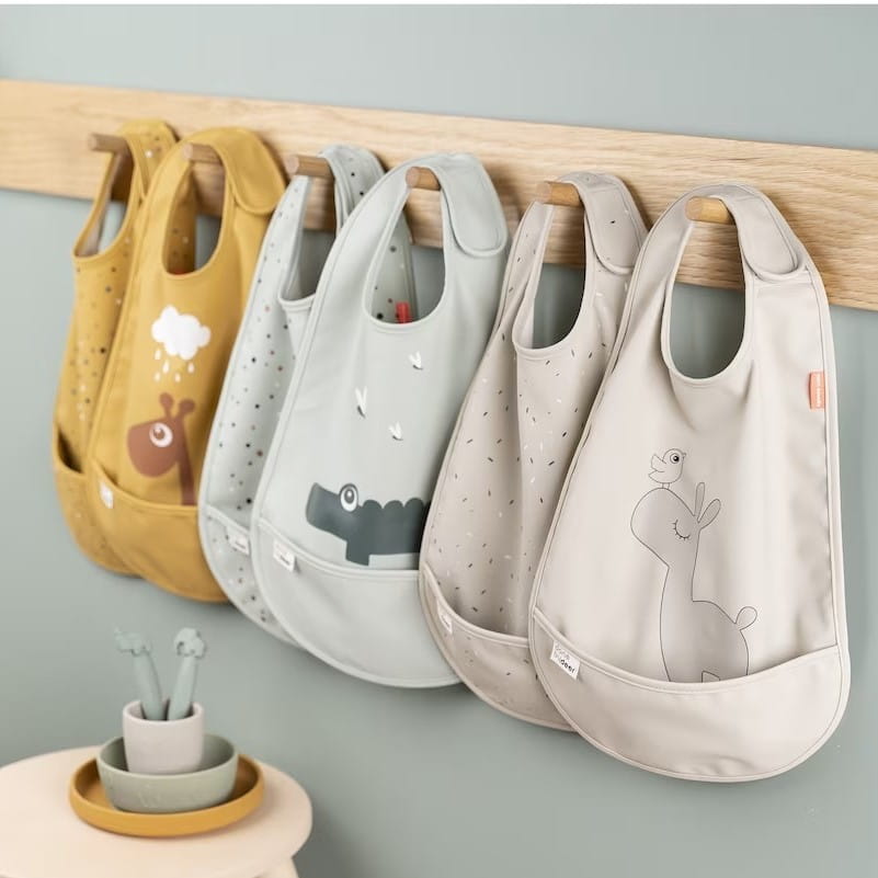 Wodoodporne, łatwe do czyszczenia śliniaki z kieszonką, która wychwytuje spadające jedzenie.