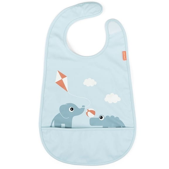 Ten praktyczny śliniaczek z zabawnym motywem słonika Elphee i krokodyla Crocona placu zabaw, dodaje odrobinę uśmiechu do każdego posiłku.