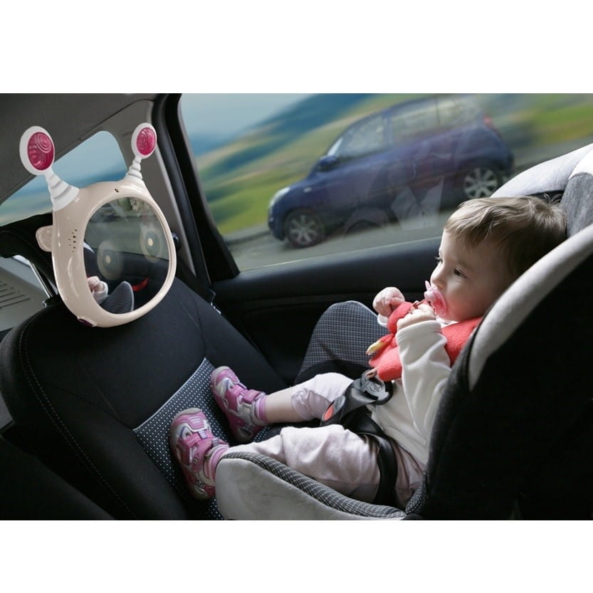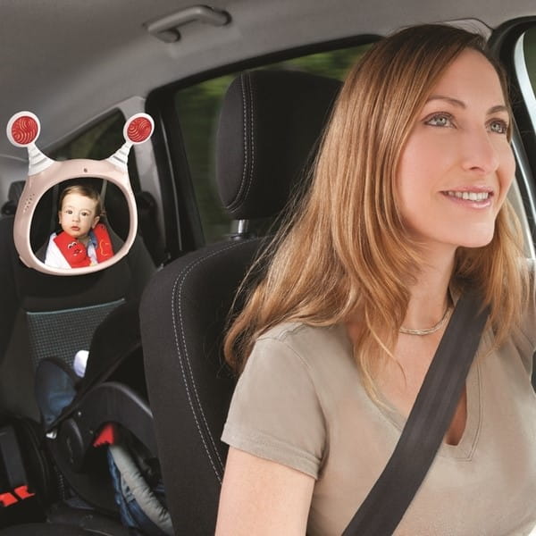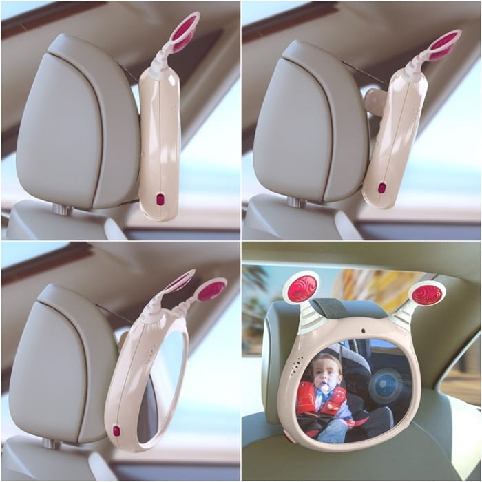 Aktywne lusterko montuje się do tylnego lub przedniego zagłówka fotela. Produkt wyposażony jest w szerokie, wypukłe lusterko, które zabawnie miga oczami, uśmiecha się i gra, umilając dziecku dalekie i bliskie podróże samochodem.