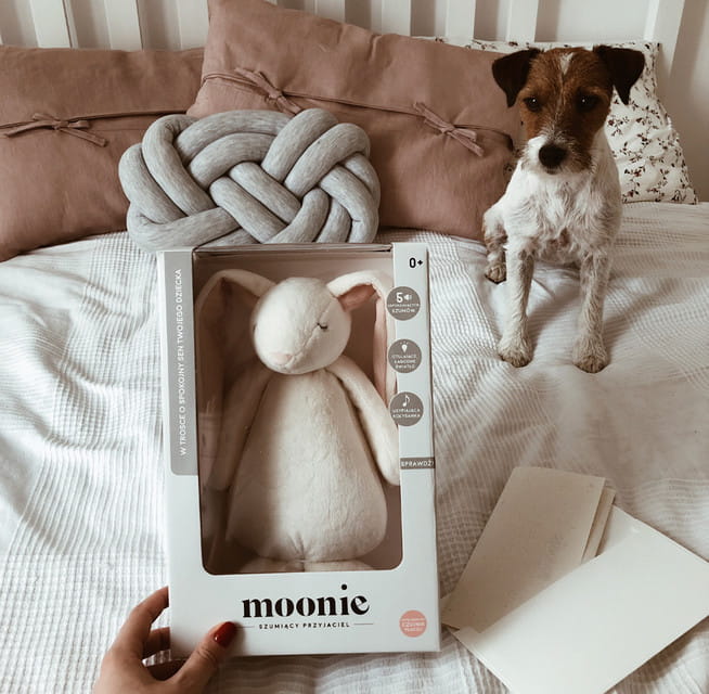 Szumy misia MOONIE, wygłuszają dźwięki z otoczenia, dzięki czemu, codzienne, domowe hałasy nie wybudzają maluszka ze snu.