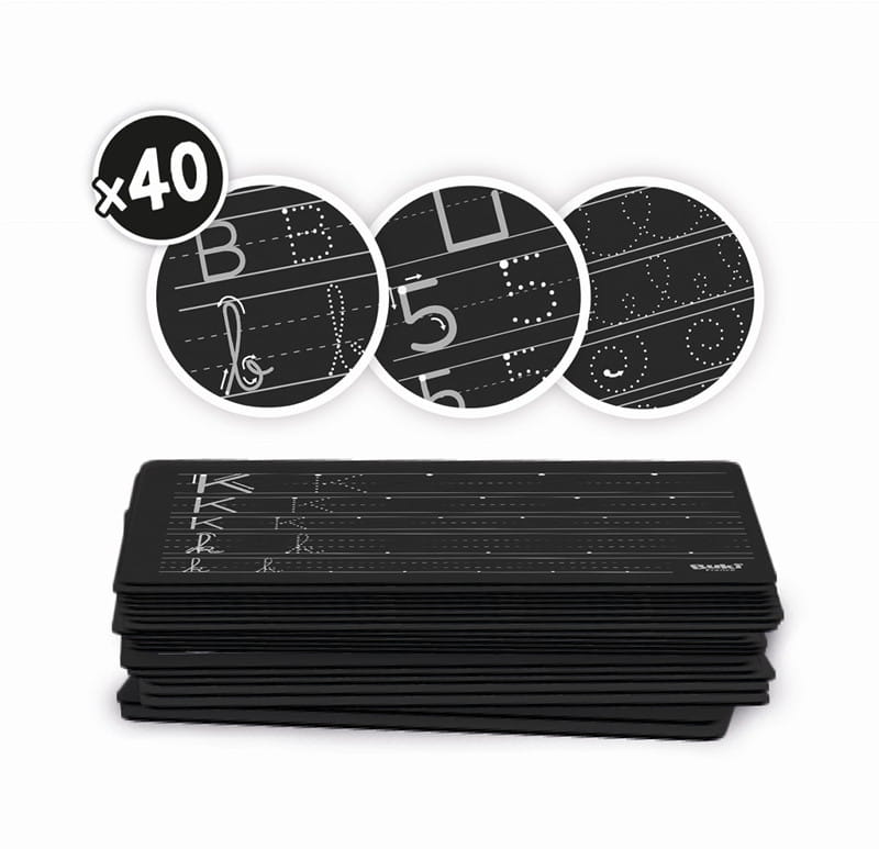- 20 kart - 40 arkuszy do nauki (26 liter alfabetu, liczby od 0 do 9, linie i szlaczki)