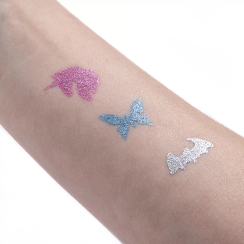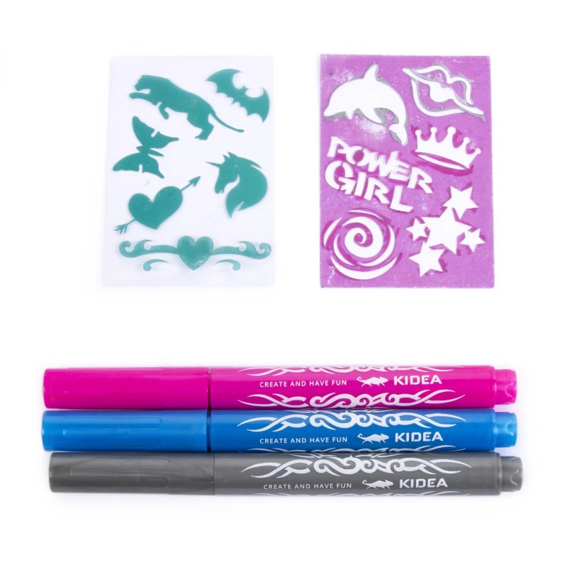 Zestaw zawiera aż 12 szablonów, dzięki którym wykonasz perfekcyjny tatuaż oraz 3 brokatowe markery (różowy, niebieski, srebrny) o niezwykłych metalicznych kolorach. Wystarczy przyłożyć szablon w dowolne miejsca na skórze i pokolorować. Do zmycia tatuażu najlepiej użyć płynu do demakijażu.
