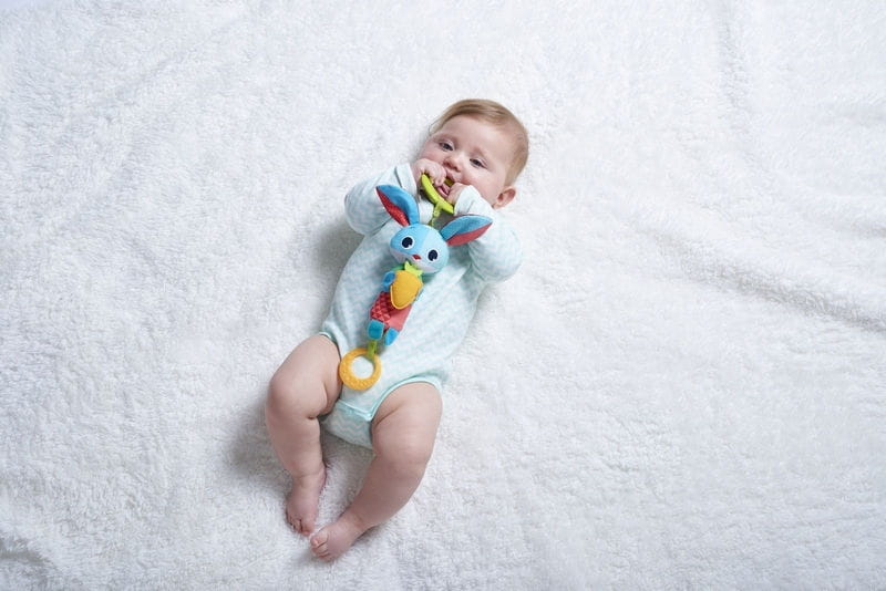 Zawieszka dzwoneczek Zajączek Thomas zachęca malucha do wyciągania rączek i ćwiczenia ruchów precyzyjnych. Dołączony do zawieszki gryzaczek ukoi przy ząbkowaniu.