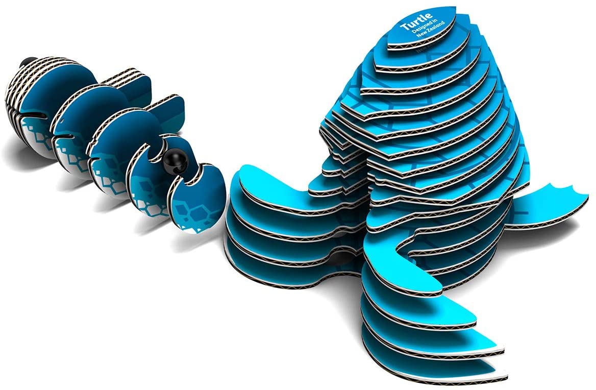Układanki Eugy zaprojektowane w Nowej Zelandii są wykonane z przyjaznego dla środowiska kartonu pochodzącego z recyklingu i farby na bazie ryżu.