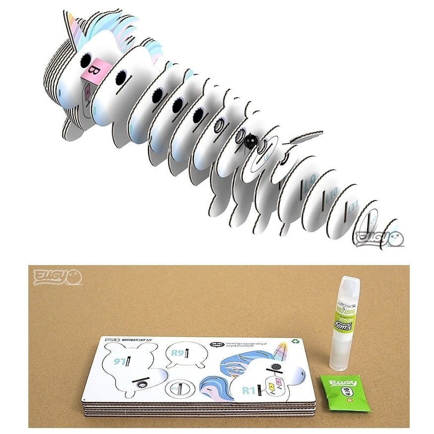 Zestaw zawiera ponumerowane elementy układanki, nietoksyczny klej oraz instrukcję do zbudowania jednorożca.