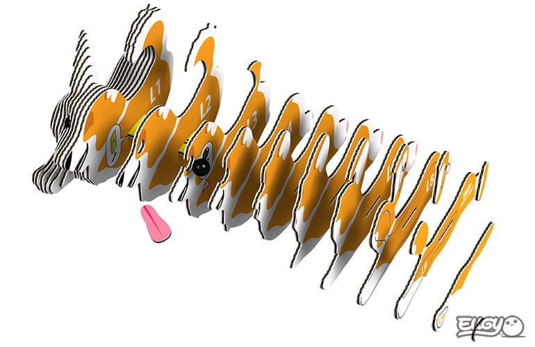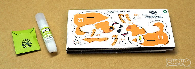 Zestaw zawiera ponumerowane elementy układanki, nietoksyczny klej oraz instrukcję do zbudowania pieska.
