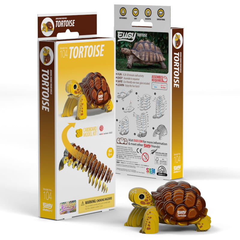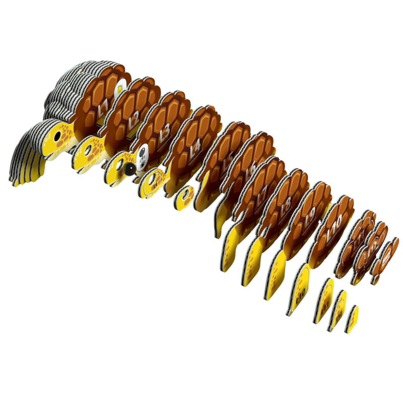 Zestaw zawiera 34 ponumerowane elementy układanki, oczka, nietoksyczny klej oraz instrukcję do zbudowania figurki długowiecznego żółwia lądowego.