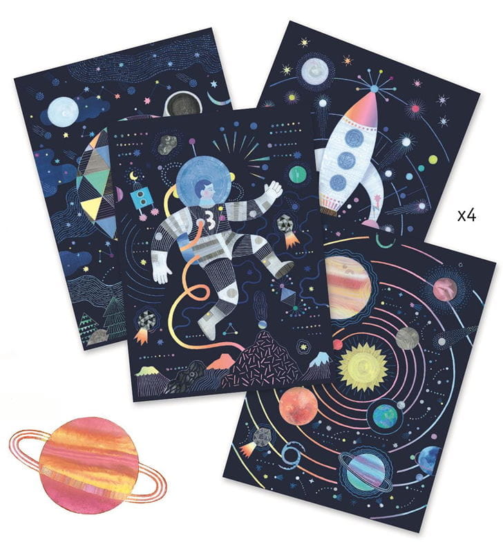 Obrazki do wydrapywania rysikiem przedstawiające kosmos, rakietę, astronautę, planety od Djeco.