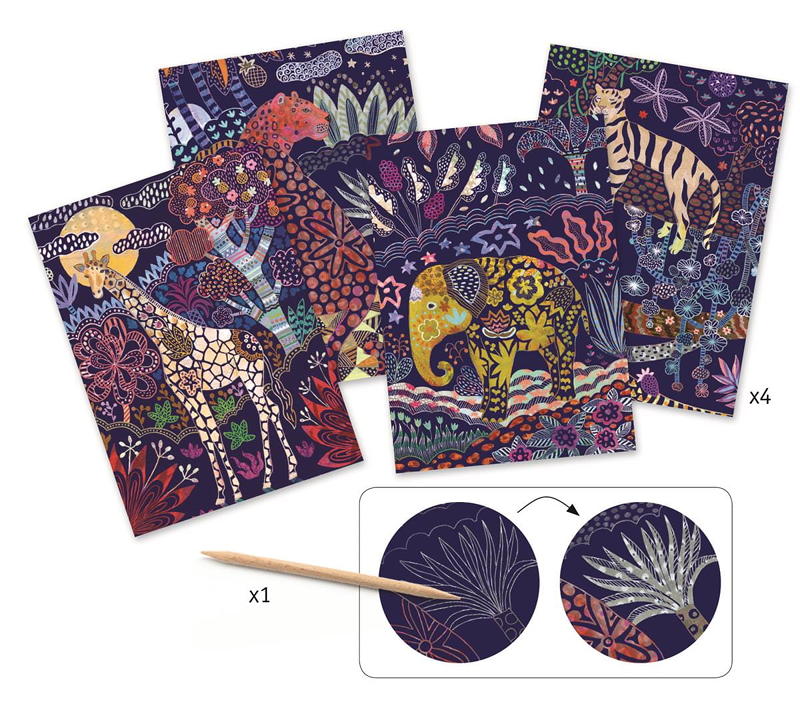 Obrazki do wydrapywania rysikiem przedstawiające afrykańskie zwierzęta w pięknej kolorystyce od Djeco.