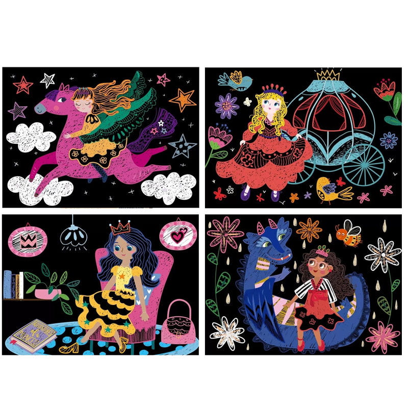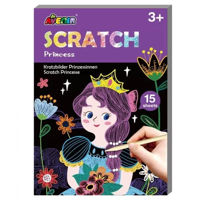 W zestawie: 13 wydrapywanek, 2 tęczowe karty do wydrapywania dowolnych wzorów, patyczek do zdrapywania.