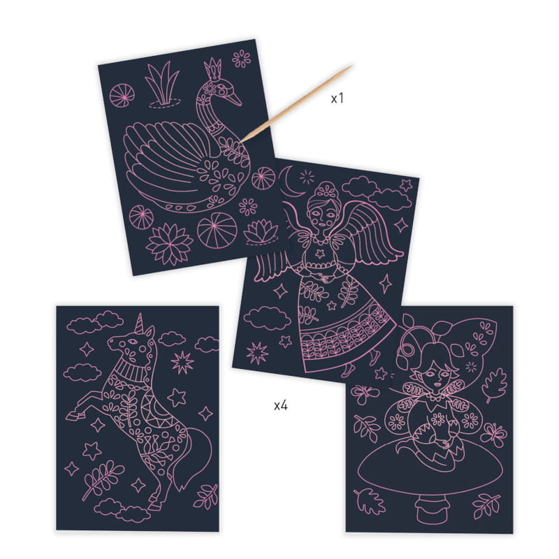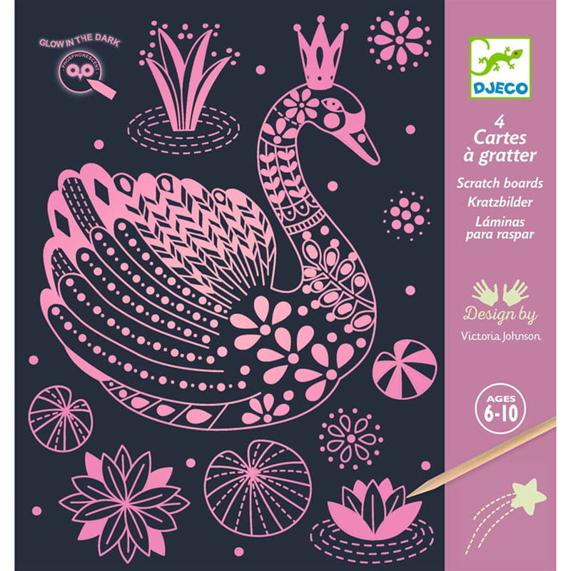 Zestaw 4 kart zdrapek, które ukazują magiczny świat, który świeci w ciemności! Po zdrapaniu odpowiednich pól dołączonym do zestawu rysikiem, otrzymamy pięknie ilustrowane obrazki z elementami fluorescencyjnymi. Instrukcja krok po kroku ułatwi poprawne zdrapywanie według wzoru.