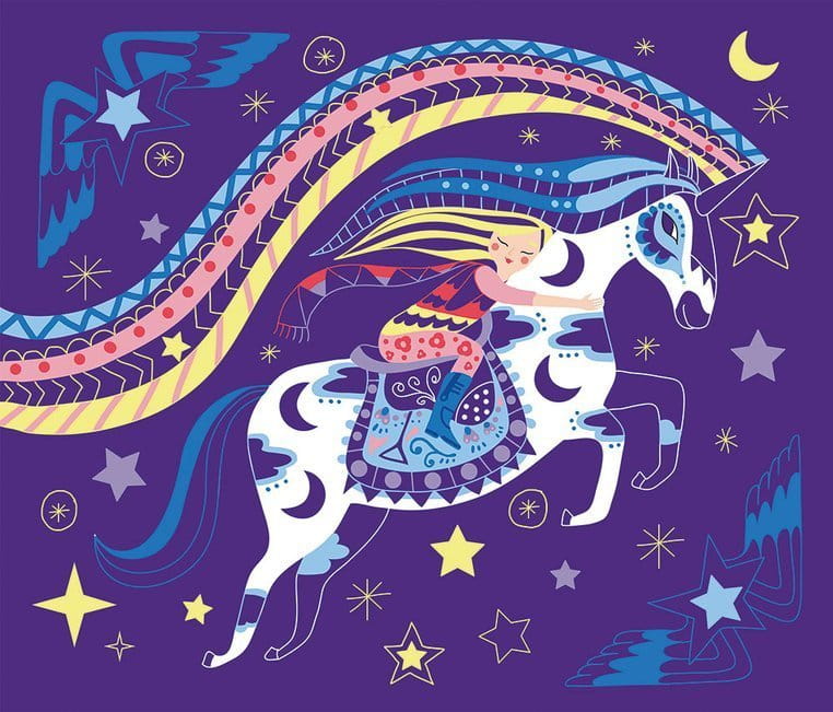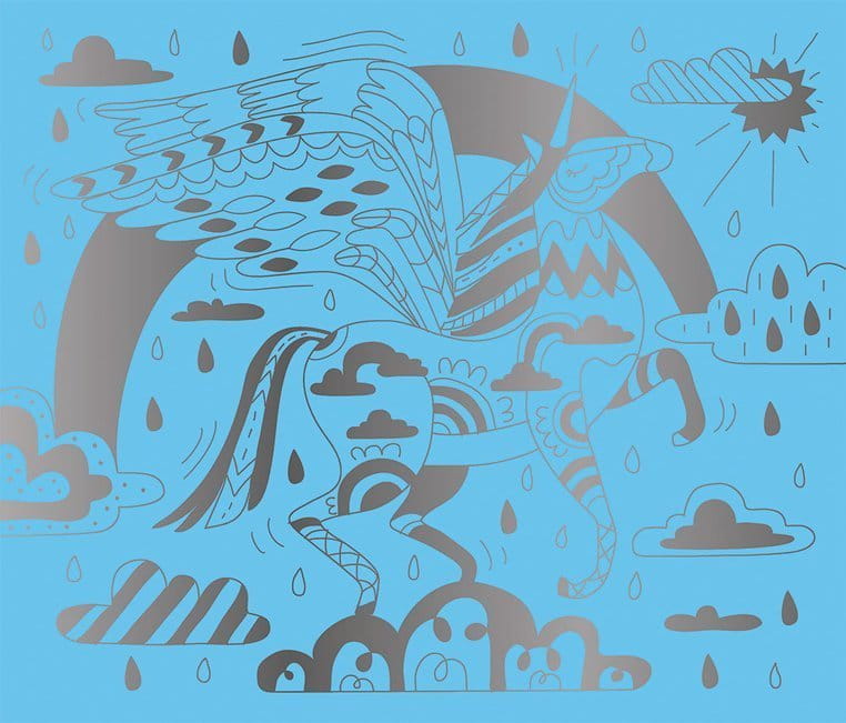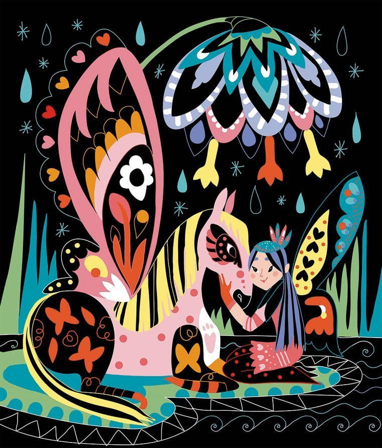 Zestaw kreatywny do zdrapywania zawiera 8 plansz z solidnego kartonu, przedstawiających magiczne życie koni i jednorożców, m.in. podniebną podróż czy kąpiel w leśnym jeziorze. Obrazki są pokryte jednobarwną warstwą wierzchnią z konturami elementów, które ukazują się stopniowo w efekcie jej zdrapywania.