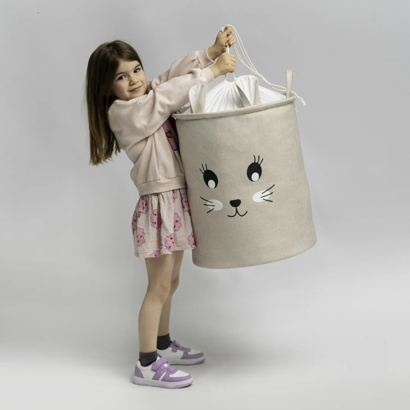 Kosz przeznaczony jest wyłącznie do użytku domowego i powinien być używany zgodnie z jego przeznaczeniem. Należy unikać umieszczania go w pobliżu źródeł ciepła, takich jak grzejniki, piecyki czy otwarty ogień, ponieważ materiał może ulec uszkodzeniu pod wpływem wysokiej temperatury. Produkt nie jest zabawką – dzieci powinny korzystać z niego wyłącznie pod nadzorem osób dorosłych. Nie wolno wchodzić do kosza, siadać na nim ani wykorzystywać go jako element wspinaczkowy. Aby zapewnić długotrwałe użytkowanie, nie należy przechowywać w nim ostrych, ciężkich ani wilgotnych przedmiotów przez dłuższy czas. Regularne opróżnianie kosza i czyszczenie powierzchni wilgotną ściereczką pomoże utrzymać go w dobrym stanie. Kosz dzięki swojej formie jest estetycznym i praktycznym dodatkiem do wnętrza, jednak podstawowym celem jego użytkowania jest przechowywanie lekkich, suchych przedmiotów, takich jak zabawki czy tekstylia dziecięce.