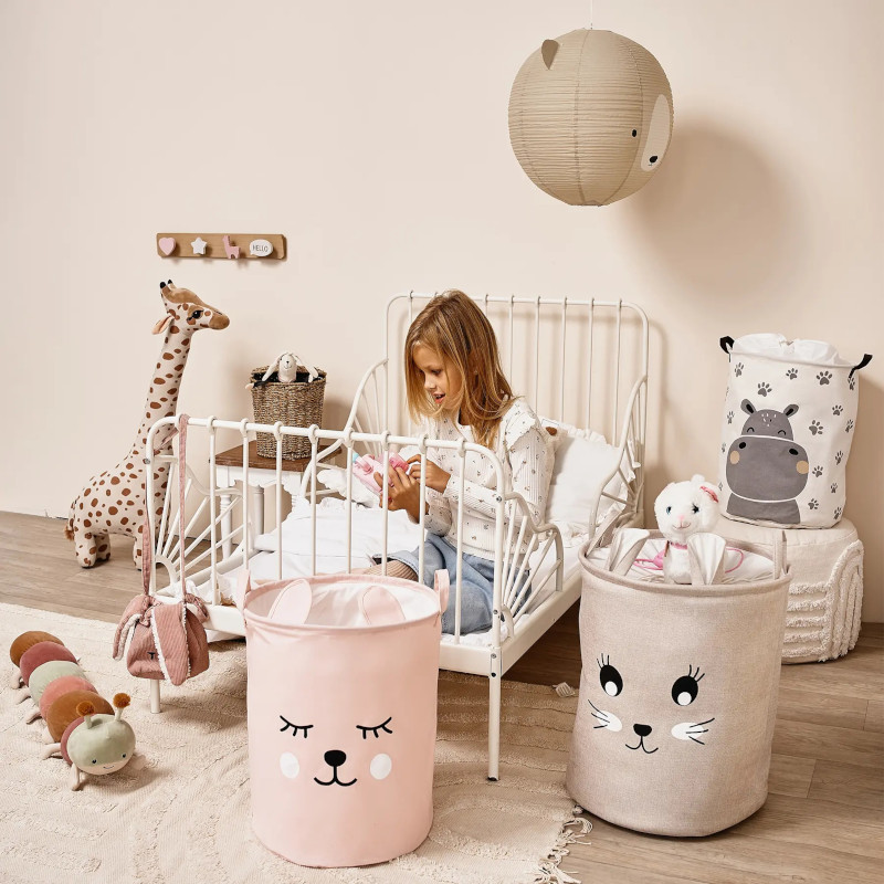 Po wyjęciu z opakowania rozłóż kosz i delikatnie uformuj jego ścianki. Dzięki pierścieniowi usztywniającemu kosz szybko nabierze właściwego kształtu. Jeśli zauważysz zagniecenia materiału, wystarczy wypełnić kosz zabawkami/tekstyliami lub użyć pary wodnej/suszarki do włosów.